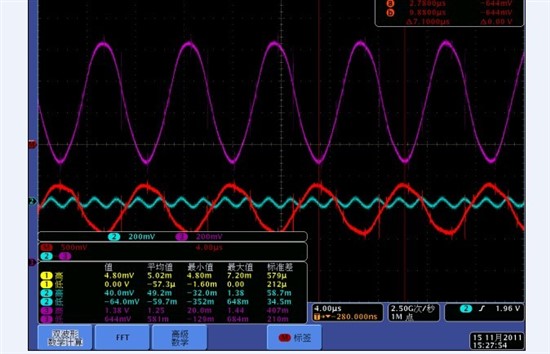 我用示波器两个探针,分别测COMM+与COMM-,得到的波形如下图2:(紫色的是COMM+,蓝色的是COMM-,红色的信号是两个信号相减后的信号)