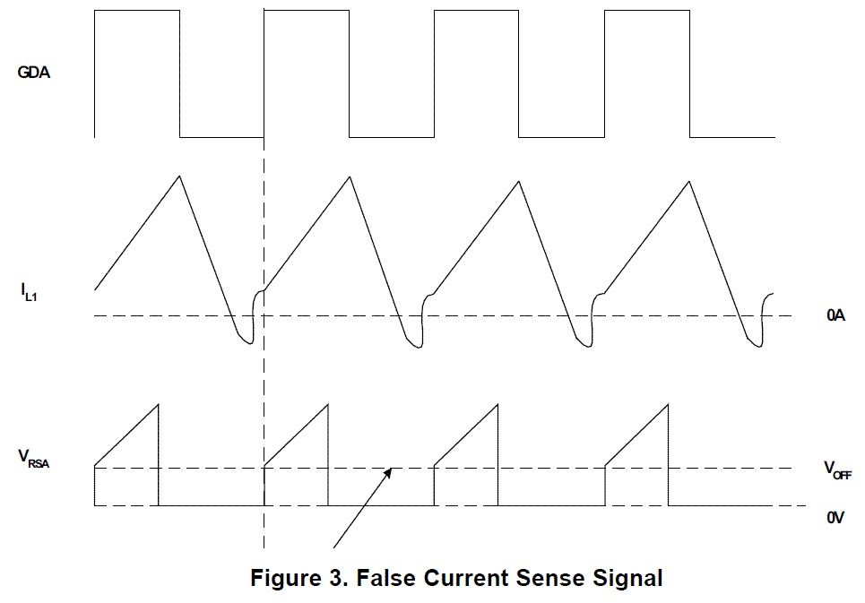 When the inductor current becomes discontinuous the boost inductors ring with the parasitic capacitances in the boost stages. This inductor current rings through the CTs causing a false current sense signal.Refer to the following graphical representation of what the current sense signal looks like when the