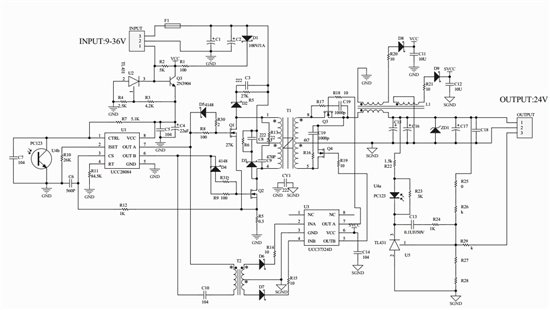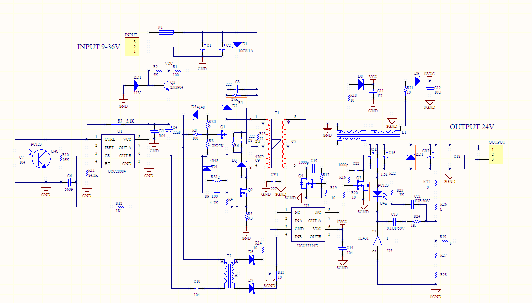 電源結構為DC-DC模塊,系列開發 4:1電壓輸入,In put:9-36V And 18-72, Out put:60W, 3.3V/12A, 5V/12A, 12V/5A, 15V/4A. 24V/2.5A.由於體積小,效率必須高才能實現。Size:25*50*11mm,金屬殼灌導熱膠。其中3.3V和5V及12V二次側要用上同步整流。目前計劃的是用如下的線路圖,做推挽。