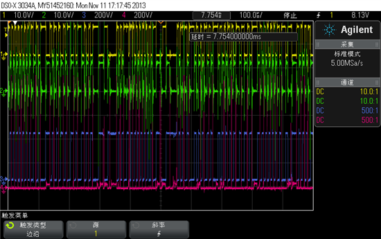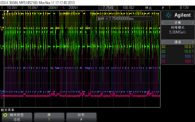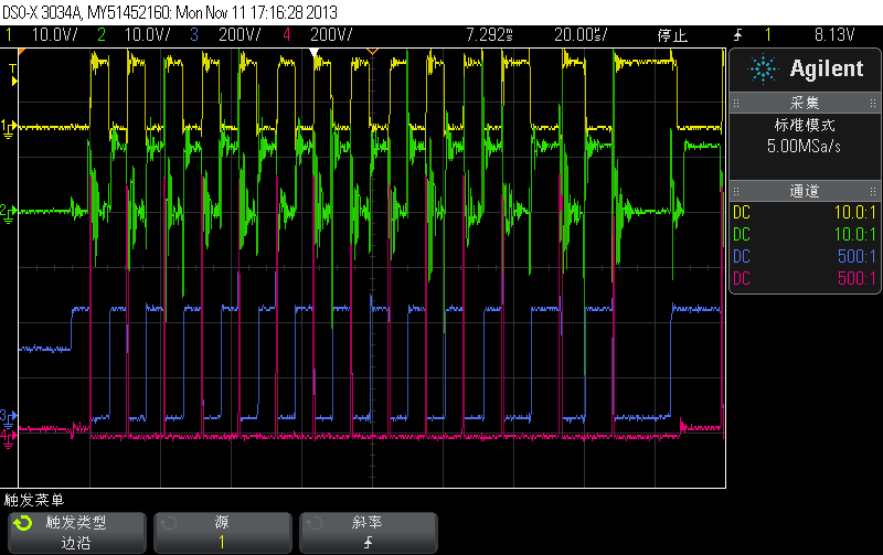 如下是我抓取的上电波形 UCC28950 没有采用同步整流 OUTE OUTF 悬空 DCM 接地 采用倍流整流 驱动管开关频率发生变化?这是什么原因呢