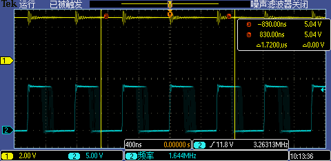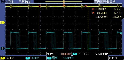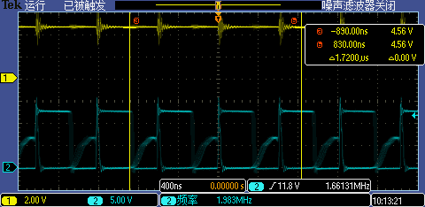 下图是刚上电时,通道2上的是SW引脚的输出波形,通道1上的是输出电压波形。