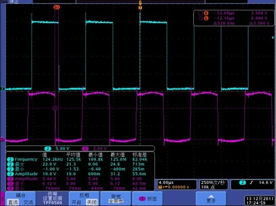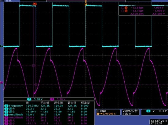 接收电感TP4测试的波形(通道3:接收电感,通道2:发射电感)