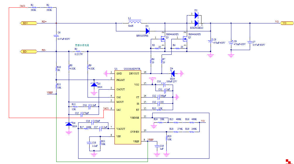 逆变器项目,2KW,用UCC3818做PFC时,上电芯片烧了,附件是原理图,请帮忙看看那里有错误。谢谢