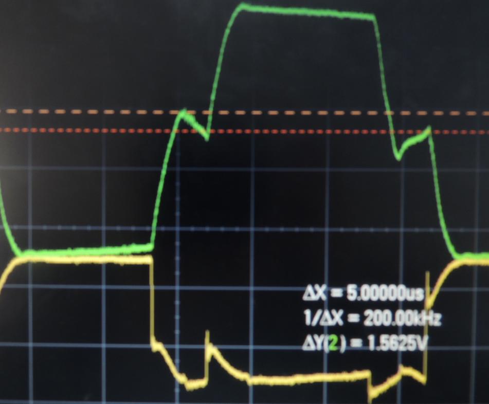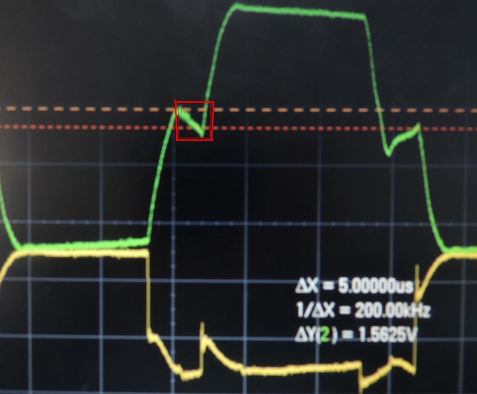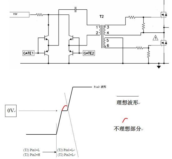 也就是在死区的时候,正常来说应该维持一小段0V,但实际波形(红色)却微微抬高,变压器T2性能没有问题(电感量和尺寸)