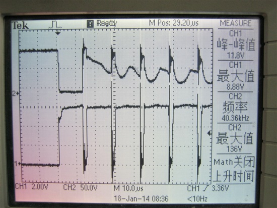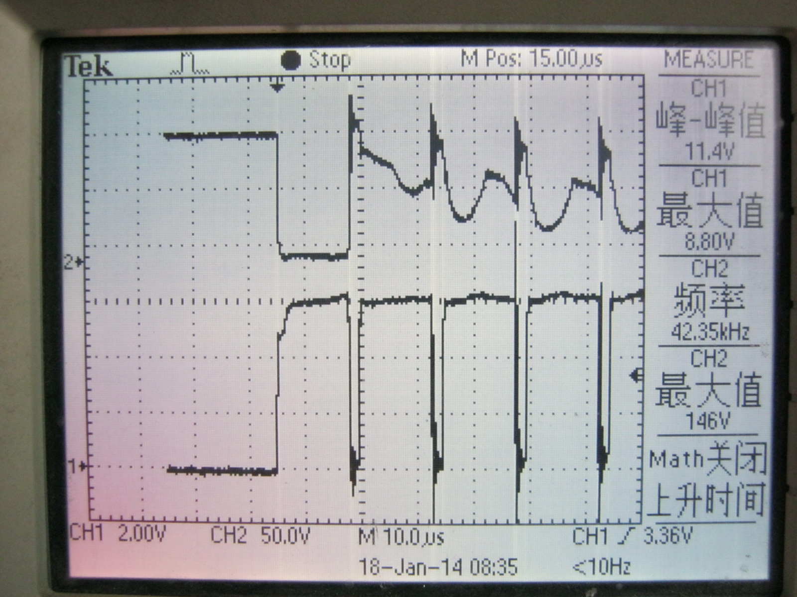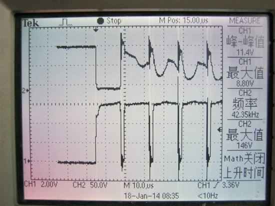 常温时可以,低温下不行,用的FQA13N80以及UC3843电路。波形上边一个为Vds波形,下边一个为对应的Vgs波形,不知道为何MOSFET在电源打嗝不停重启动期间,没有由截止进入饱和?图中为低压100Vac下的输入下的轻载波形。高压下265Vac输入时,启动就很容易炸机了。明显MOSFET的工作状态异常。