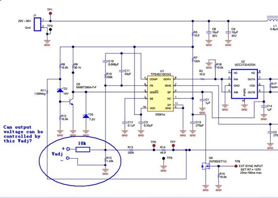 TI的TPS40210这款芯片方案中有20~30V转100V/280mA的方案:http://www.ti.com.cn/tool/cn/pmp8913 ,我现在想调整输出电压范围,比如通过某种方式调整输出电压范围为30V~100V。请看下图,如果我在TPS40210的反馈端按照如下图所示接一个控制电压,能否实现调节输出电压的目的呢?因为我看到http://www.ti.com.cn/tool/cn/pmp5143有这种方式调整输出电压的。所以请教TI专家们指点一下,谢谢!