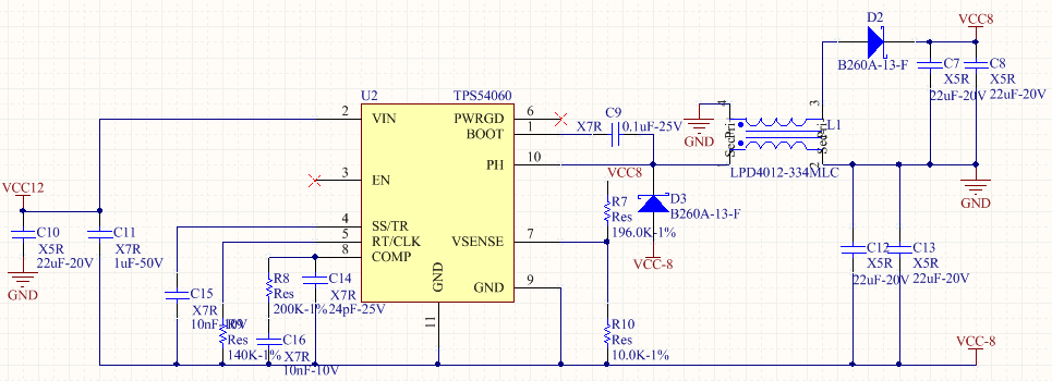 参考TI公司的slva369a文档用54060做了一个分离轨12V转+-8V的电源,外围分立器件参数按照slvc225b提供的SWIFTPOSNEG-CALC-v4做了计算,但是空载上电现象Vpos=2.3V,Vneg=-3.2V,Vsense=-2.9V。请问什么地方出了问题呢?