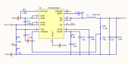 至于去除R97后,芯片输出仍然不如预期,则需要排查是该片芯片设置问题,还是受其他芯片影响。由于您第二级有三片芯片,建议您将3.3V输出之外的另外两块芯片disable, 同时去除R97将3.3V的EN 管脚floating, 再次检查VCC5.0和VCC3V3输出是否正常。如果不能输出期待值,请检查VCC5.0输出,3.3V输出芯片的Vsense电压和SW 点波形。