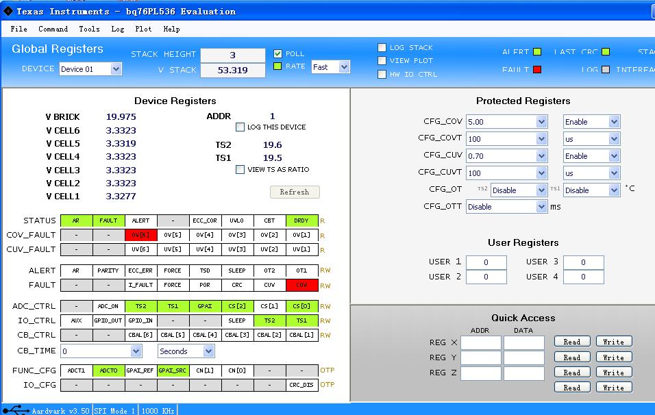 1.单芯片工作,即CELL1-到CELL6+接6串电芯电压端,CELL7-到CELL18+不接电芯,对BQ76PL536 EVM-3进行测试,各项参数蛮好,与规格书保持一致,