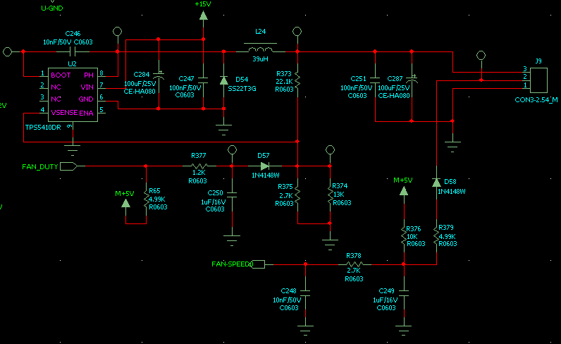 我现在有一个TPS5410的电路,但是有一点看不明白。这个电路是用来进行风扇调速的,但是这个功能怎么样实现我没看明白,麻烦帮忙看一下,电路图如附件所示。