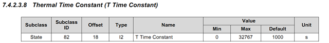 T Time Constant is the thermal time constant that is used in single time constant heating-cooling thermal modeling. The default setting can be used, or it can be modified to improve low-temperature accuracy if testing shows the model does not match the actual performance. T Time Constant defaults to 1000. This is sufficient for many applications. However, it can be modified if better predictive accuracy at low temperatures