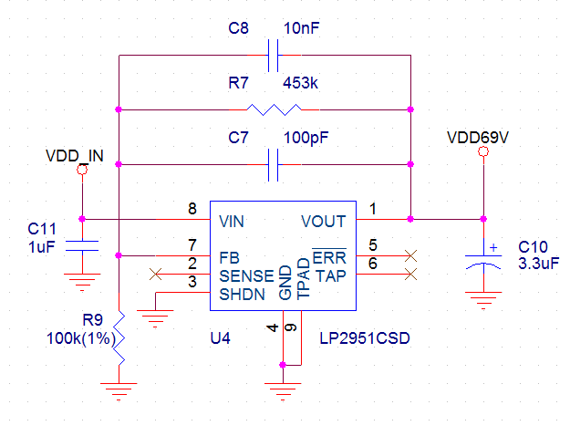 用LP2591CSD搭的一个电路,输入7.2V~12.5V,输出6.9V,电流50mA左右。电路图见附件。SENSE,Vtap和ERROR悬空。