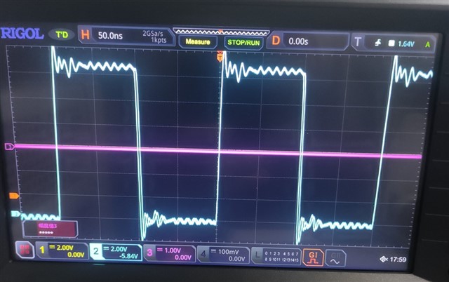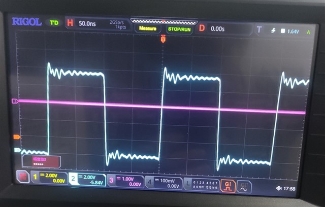 仔细观察可以发现,此时的脉宽以“大-小-大-小”变化。把输出接入频谱仪,可以看到产生了2.5MHz的1/2次谐波。