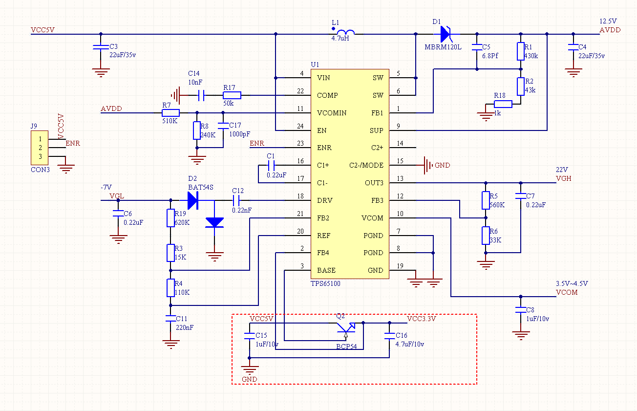 我用TPS65100搭了个电路,驱动一个天马的8寸屏(和群创是一样的),电路按数据手册的推荐。