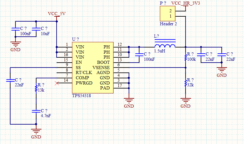 我在使用你们的TPS54318芯片做电源管理,我的设计需求是5V输入,3.3V输出,缓启动时间是10ms,有几个问题想请教: