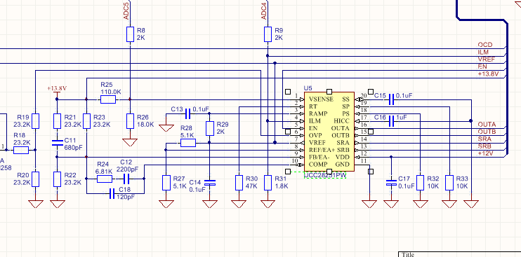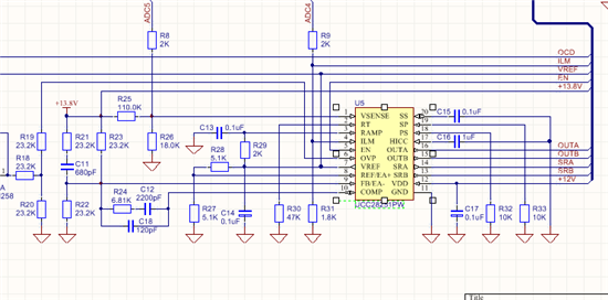 原理图如上,但板子上电后OUTA\OUTB输出 一小段后 就没有了,用万用表测量VREF发现时9v多。查看手册理解为vdd通过一个ldo后产生的一个3.3v的VREF。不知道哪里出的问题,现在测试情况是图片中的电路单独上电,OUTA/B SRA/B 直接连接示波器。
