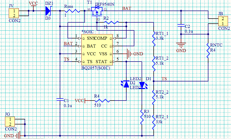 各位大虾,小弟正在做一个手机充电电路,最开始的时候用的是bq2057,4.1v的那个,电路原理图的和pcb板图在附件里。参照的是TI bq2057数据手册里面的,但是我用的采样电阻是1欧10w,mos管是p沟道的F9540N,最开始正向串了一个5.1v的稳压管,后来把他短了。开始也用了NTC电阻,然后RT是根据手册里面的公式算 的,采用的是两个指示灯。现在就是有个问题想请教,我想提高他的充电电流,在我的电路进入恒流充电的时候也就是Vbat大于Vmin门限的时候,MOS管的导通程度严重影响了充电电流的大小,最大电流380mA。于是我想换一个mos管,打算用TI的CSD25402Q3A不知道行不行,还有个就是我想把TS端不用,也就是温度故障功能不要,该怎么接,那两个RT取值好多。感谢!