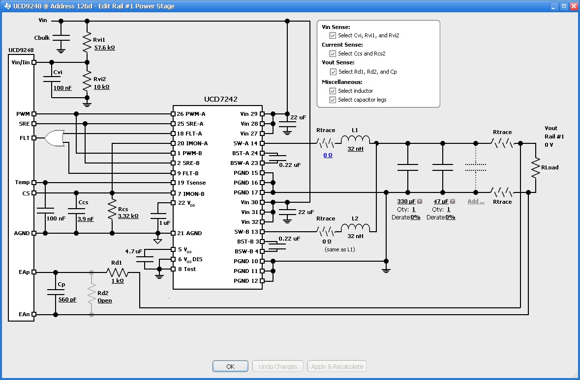 我设计的7242两路输出是不同电压,独立存在的。可是使用FUSION DIGITAL POWER DESIGNOER软件的时候原理图中两路输出是并联使用的。如何变成1/2的UCD7242.附图如下