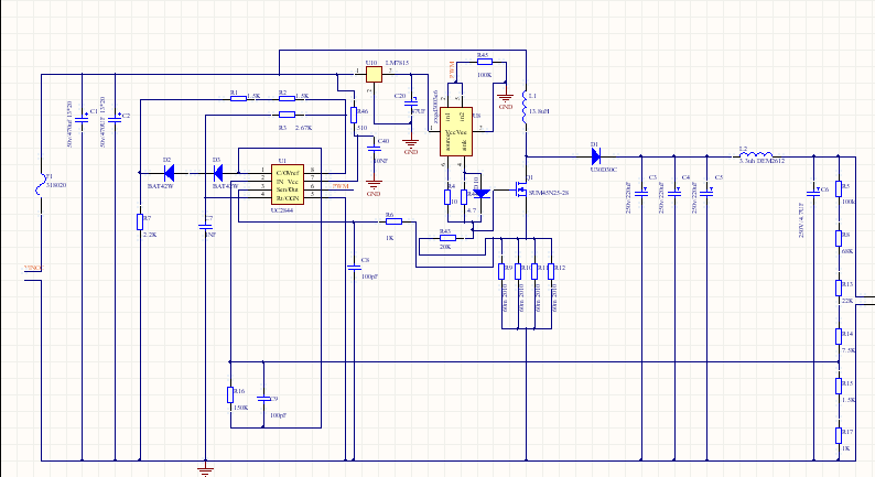 工作频率在250k ,且电流反馈波形很糟糕,用示波器探c8的波形尖峰比直接探mos的s极要高,还请大家都讨论讨论。周一我抓下波。给贴出来。