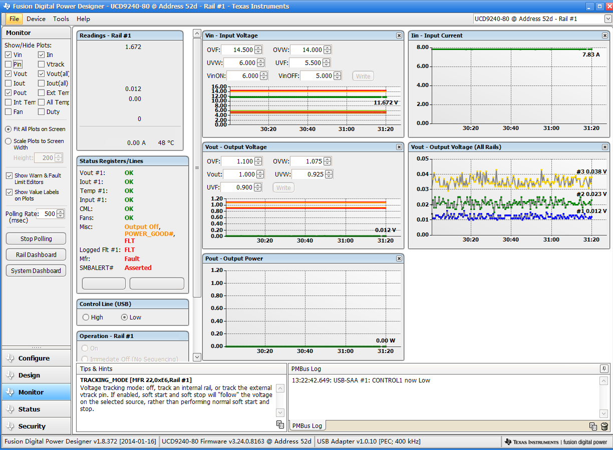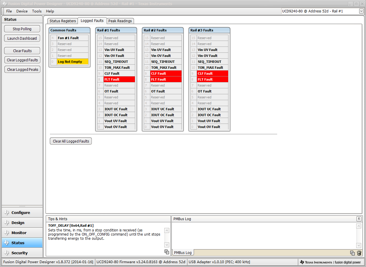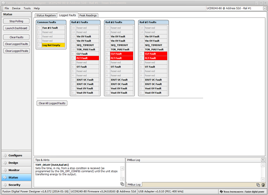 本人在用PMBUS 在Fusion Design Online调试时发现的MONITOR和STATUS的情况如图,可能是哪方面出了问题?