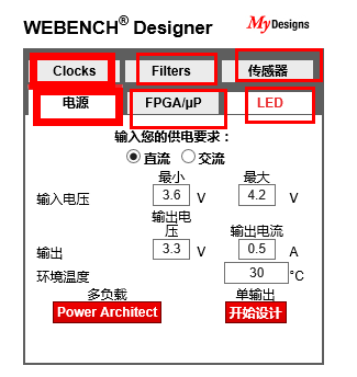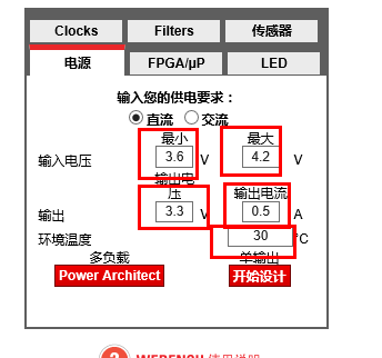 第三步,小伙伴们赶紧选择自己想设计的类型和输入自己想要的参数吧,如下图,这是我设计的参数设计哦,最小输入电压3.6V,最大输入电压4.2V,输出电压3.3V,输出电流0.5A,环境温度选择默认的30度,然后点击开始设计,华丽的进入第四步。