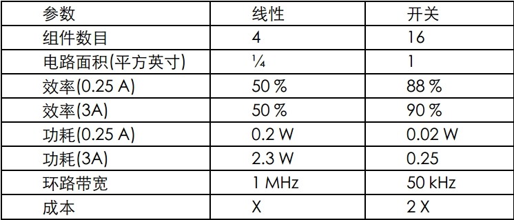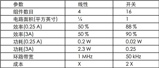 平均电流是验证系统测量的一个重要数值,因为它对确定正确的电源拓扑很重要。例如,我们可能会在开关式电源低功耗和线性稳压器的低成本和小体积之间进行权衡。表 1 显示了开关式电源和线性稳压器在组件数目、面积要求、功耗和成本等方面的对比情况。该表适用于可输出3A峰值电流的一些稳压器。有趣的是,如果峰值电流一直存在的话,就很难处理高功耗。建立DC 电流将有助于做出正确的选择。很明显,从各个方面来看,线性稳压器 都是更佳的选择。