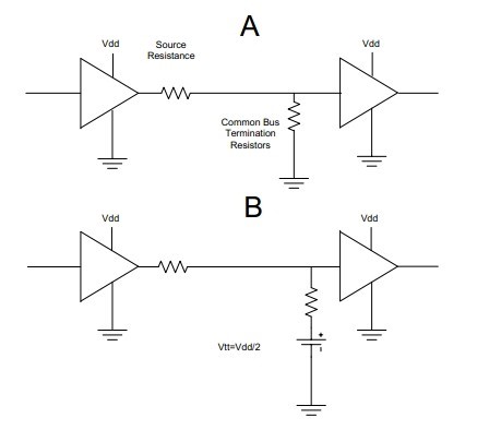 第一种方案(A)中,总线终止电阻器放臵于分配网络的末端,并连接至接地。如果总线驱动器处于低态下,电阻器的功耗便为零。在高态下时,电阻器功耗等于电源电压(VDD)平方除以总线电阻(源阻抗加端接电阻)。平均功耗为电源电压平方除以两倍总线电阻。