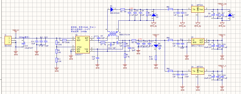 空载上电时,D3处电压为5.7V,U3输出为3.38V;在U3处加一个50Ω的功率电阻,再次上电,此时D3处电压将低于设计值5,7V,仅3.5V左右,但是在输出处加入一个小扰动,例如用示波器测量50Ω电阻两端的电阻(本质上增加了一点点的输出电流),此时输出电压达到5.7V的设计值;