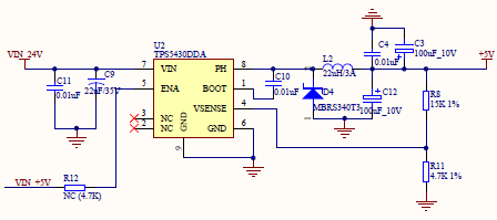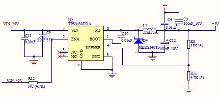 TPS5430芯片更换为TPS5450芯片,二极管采用两个MBRS340并联,电感更换为22uh/6A和33uh/6A时故障仍然存在。下图是原理图。