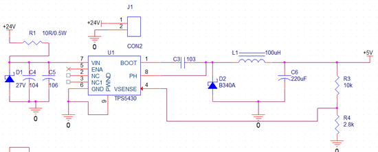 您好,最近调试TPS5430发现上电后5430很烫,一段时间后就开始过热保护,不断的跳电流。输入24VDC,输出5VDC,电流0.1A,但是用的续流二极管是B310,3A/40V的,100uH电感220uf电容。不知道是不是这个续流二极管的原因。第9脚已经接地,PH也做了个大面积铜箔。谢谢