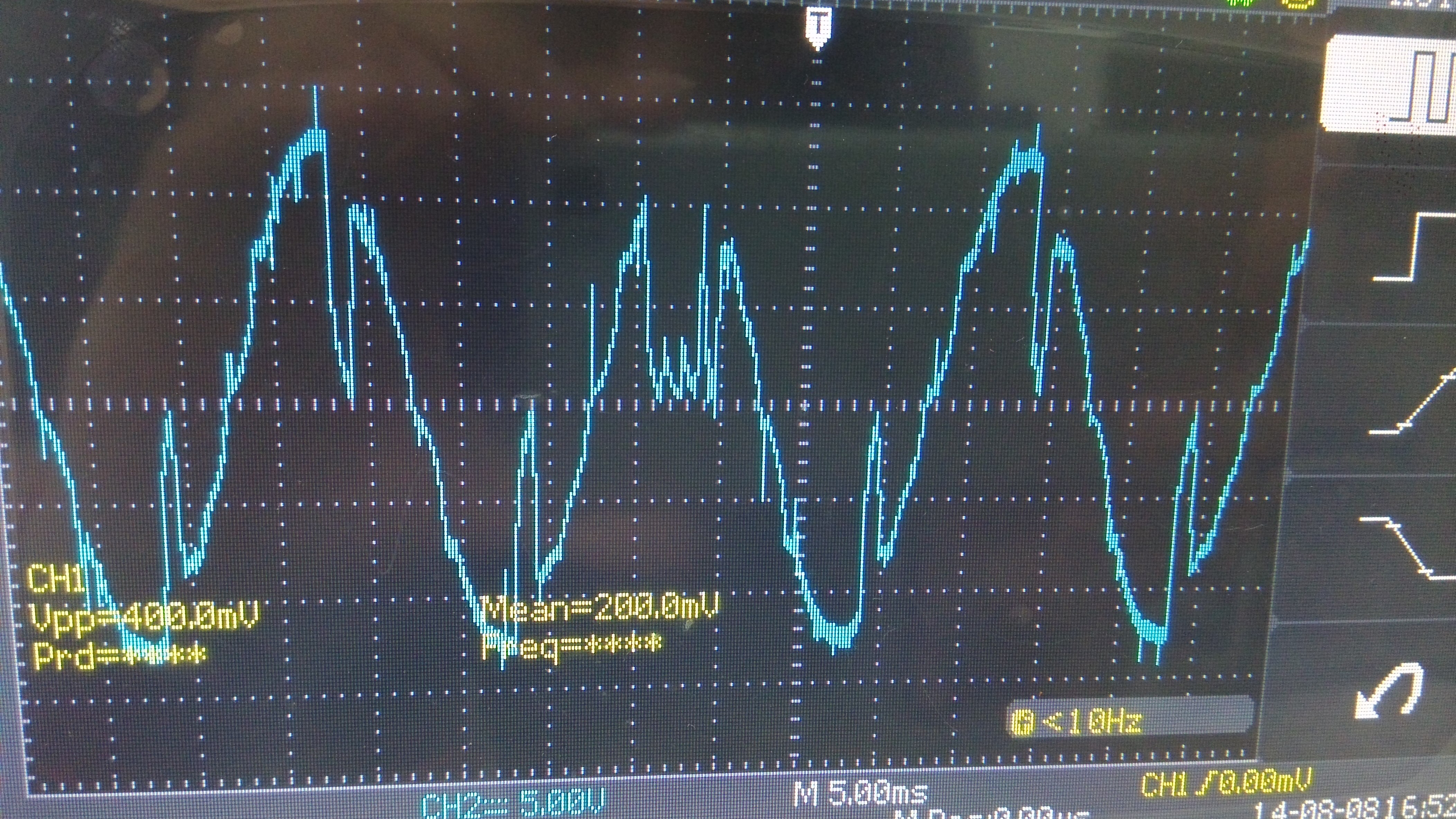 ucc28019功率因数校正输入电流波形到峰值总是这种问题(换了几个电感波形到峰值就降为零又升上来又将为零),电路与数据手册基本一样的,只有采样电阻有变化,小负载带不动,我应该怎么去改?在线等