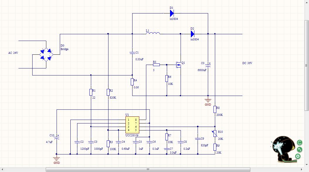 ucc28019功率因数校正,AC24转DC36,用如下电路图搭建,输出的电流波形是正弦,带载能力也可以,36欧姆电压都没有掉,但是效率只有百分之40多,测得100欧姆负载,交流输入电流就达到了1,2A,MOS管和整流桥都不发热,这是什么原因?