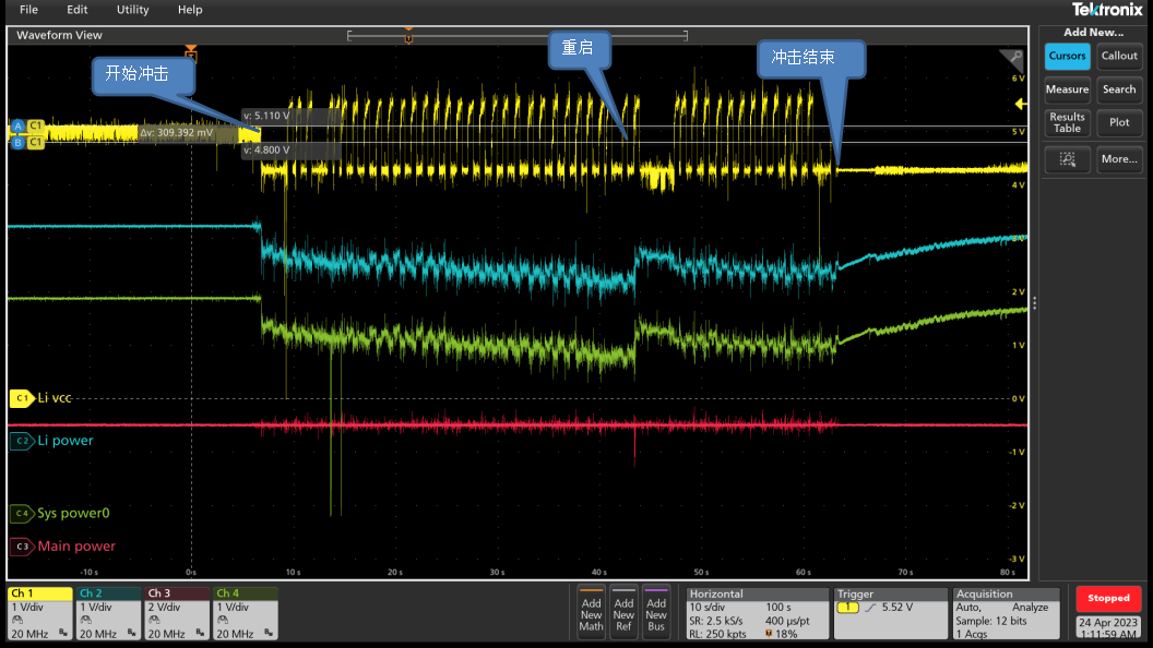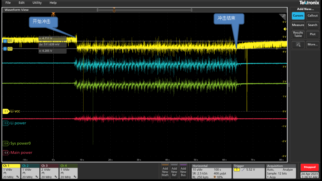 2. 刚开始干电池的电量充足,在25606开始冲击后它的输入电压会出现电压升高的情况,此时容易出现重启的现象。