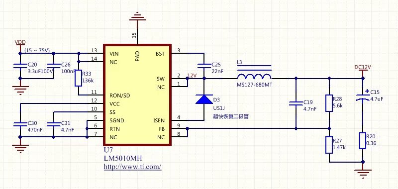 LM5010输入25V,输入限流100mA, 按官网设计参数装好电路, 加电后输入电压拉到7V,电流超过100mA,未接负载,请教是怎么回事?