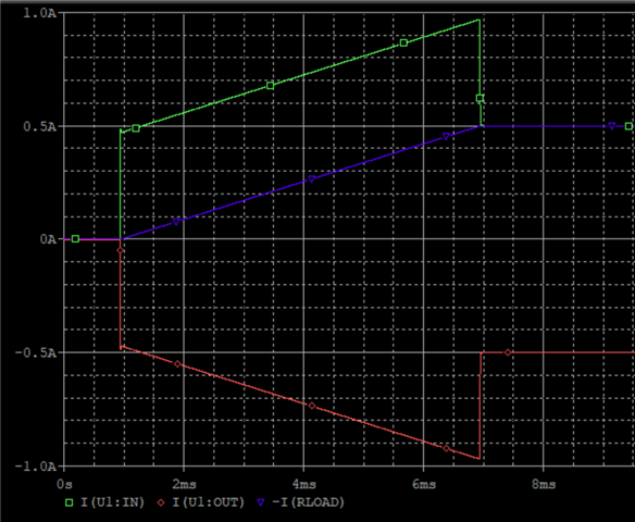 使用TI提供的仿真文件,修改其中的Rimon值,想实现限流的目的。目标是将Ilim设置在600mA,根据手册中的R = 6595/ Ilim 计算的电阻值为10991欧姆。