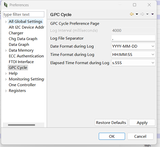 我在利用BQSTUDIO采集电池模型时,想设定GPC CYCLE的扫描时间间隔为5秒。而BQSTUDIO的preferences中GPC CYCLE下的时间间隔的设定为什么是灰色的?我该如何设置?