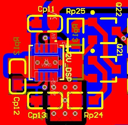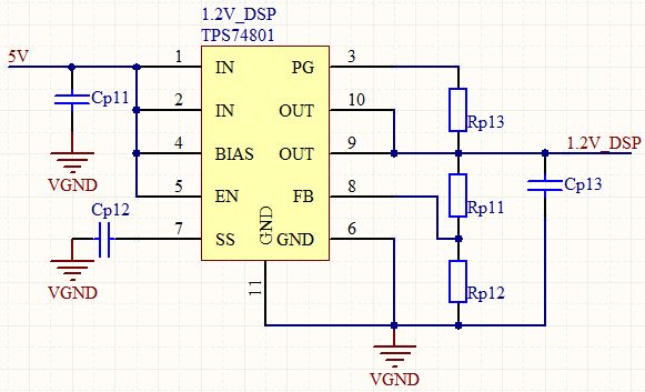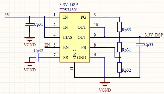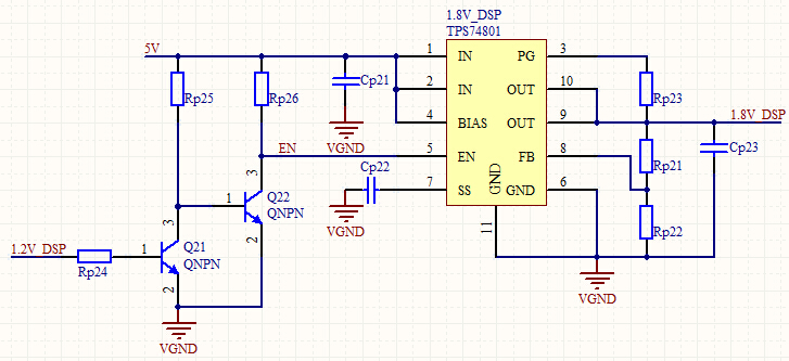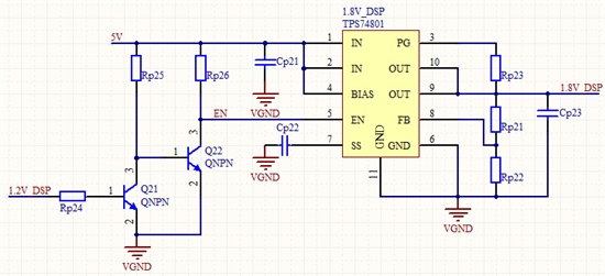 采用TPS74801芯片分别产生1.2V,1.8V,3.3V给DSP供电。原理图采用官方推荐电路,同时采用2个NPN三极管使得1.8V和3.3V在1.2V之后上电,原理图如下所示: