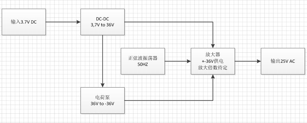 方案2 框图如下: 因为对功率没有要求,所以打算用放大器直接放大,不过问题是不知道有没有供电电压这么宽的放大器,可行性值得商榷。