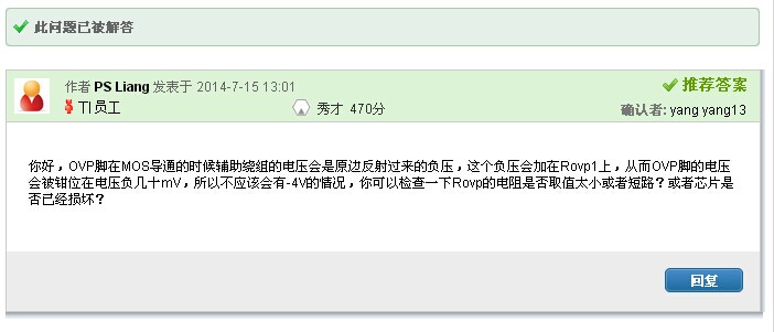 此时问题有更明晰的指向,为OVP点的电压不对, PS Liang给出了检查一下Rovp的电阻的对策。yang yang13是终确认也是这个原因所至电路不正常,至此问题解决。