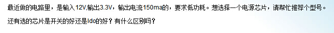 电压转换是设计电路经常遇到的问题。输入12V、输出3.3V的电压芯片更是经常用到的。关于如何选择一个电源芯片,下面的帖子给了建议,可以参考。http://www.deyisupport.com/question_answer/analog/power_management/f/24/t/875.aspx