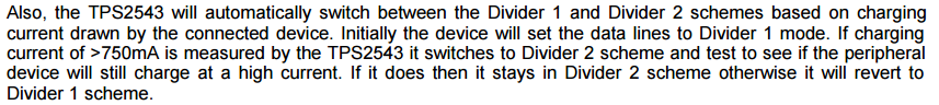 切换的条件如下图,理论上是会实现先工作在Divider 1模式,如果充电电流持续增加,再工作在Divider 2 模式下,支持更高的充电电流。建议你实际测量测量VUSB的电流的具体值是不是真的是1A。