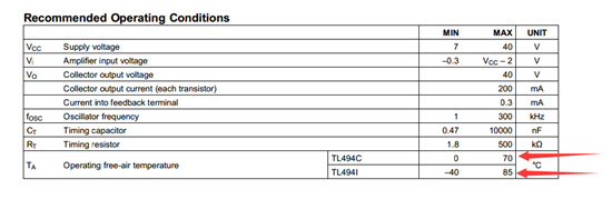从芯片的数据手册可以看出,TL494I和TL494C在温度上是又很大的差异的。