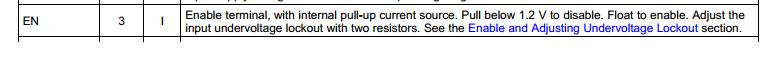 对于楼主极为关心的EN脚问题,其实我们可以从其DATASHEET中查到,如下图所示:从你描述可以看出来,EN脚其实就是一个IC的使能功能脚。低于1.2V的时候可以关断。但是,仔细想来的话,这里其实还有另外一个功能,就是输出或者输入电压的检测保护功能,如果用输出的分压电阻来做,也就是EN会通过低边电阻接到地,EN上拉电流源,只要电压低于1.2V就可以关掉IC了,当然这个还可以通过单片机来控制。