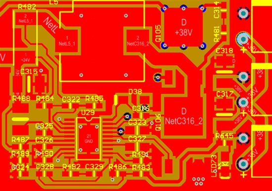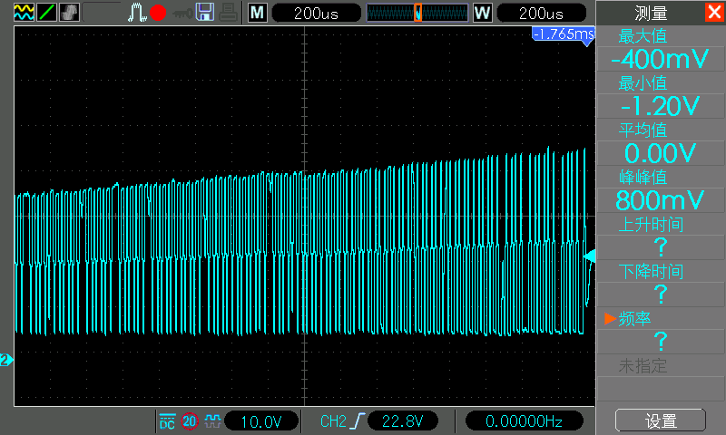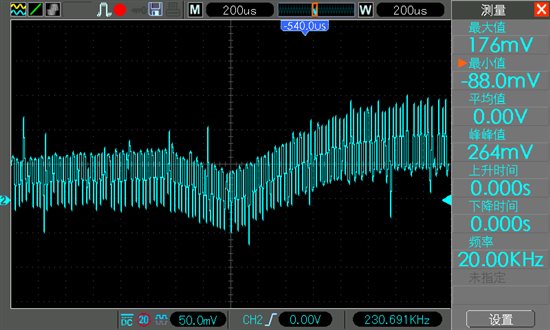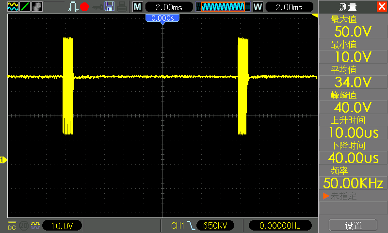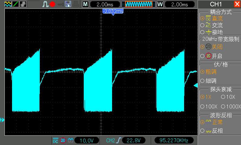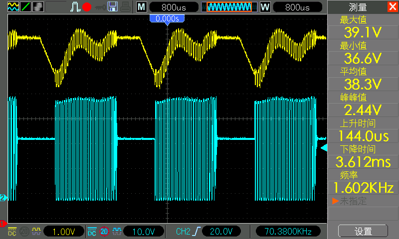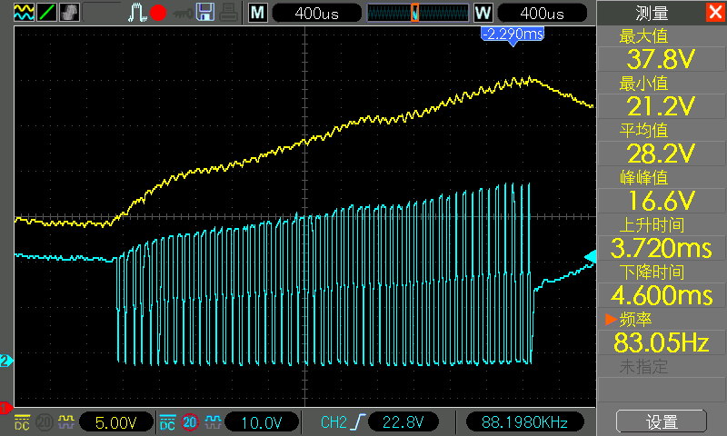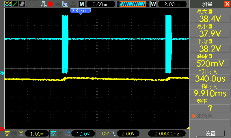 4、电感发声,并随着电流的增大而增大,最后但电流为2A左右时,周期伴随着开关关断的声音,同时输出电压波形也随着关断声音在38V-22V之间呈周期性振荡,开关电源输出电流也不正常了
