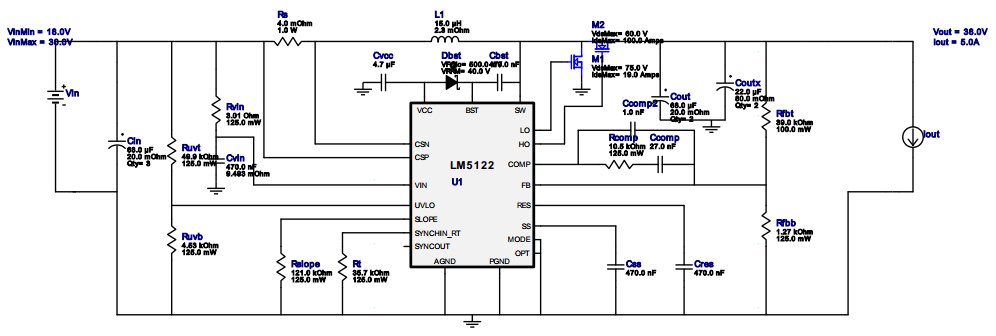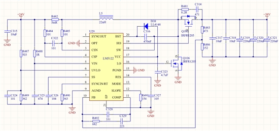 2、当带负载时随着负载电流增大,输出电压峰值跳变的厉害;输出电流为2左右时最差,输出电压与输入电压一致,感觉就是LM5122停止工作一样
