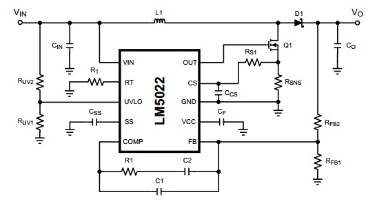 其实这个用法只是LM5022的一种拓展用法。其原本的设计是用来做boost以及sepic方案的,如下图的典型应用。才是其看家本领呢。