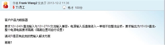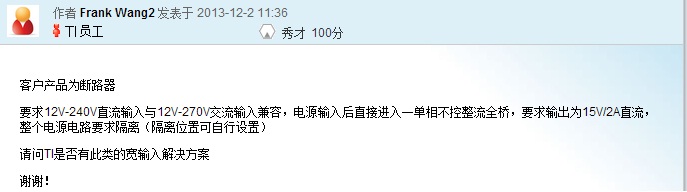我们都知道LM5022是一种升降压转换器,但是其输入电压范围比较有限,只有6V到60V,那么,可以用LM5022实现12V到240V宽电压输入隔离电源设计吗?答案是肯定的,我们来一起看看楼主的问题:要求12V-240V直流输入与12V-270V交流输入兼容,电源输入后直接进入一单相不控整流全桥,要求输出为15V/2A直流,整个电源电路要求隔离(隔离位置可自行设置)请问TI是否有此类的宽输入解决方案?帖子链接如下: