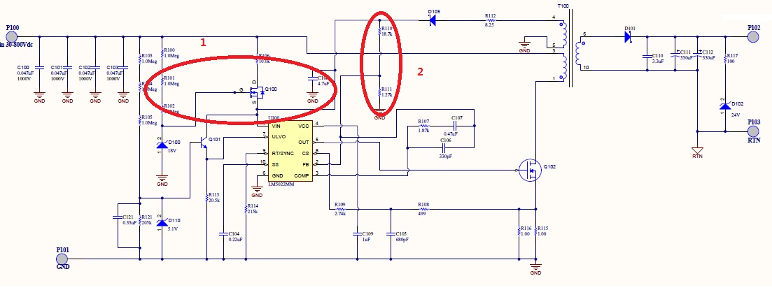 如上图所示,要解决宽电压输入问题,首先需要解决高低压启动的问题。首先,对于低压启动的时候,一方面要满足最低电压的要求,另外一方面还必须满足高压输入的时候,启动电路带来的巨大损耗的问题。解决这个问题的技巧就在上图的红色圆框1中。从上图我们可以看出来,随着MOSFET Q100的开通,VIN的电压冲高到6V以上,满足LM5022的启动条件,此时,LM5022开始工作。输出开始建立,辅助绕组开始供电。