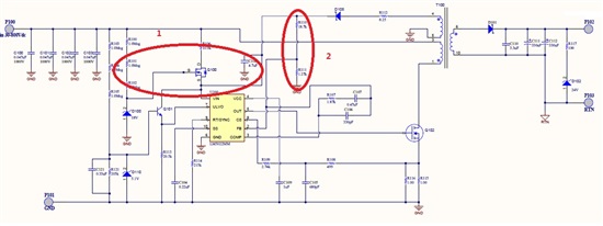 一旦VIN的电压达到16V左右,由于稳压管D100的的钳位作用,MOSFET的GS电压低于2V,MOSFET关断,此时由变压器辅助绕组开始供电。这里就是本设计的第二个亮点了。如图圆圈2的设计所示,建议反馈绕组的电压在16V以上,可以保证MOSFET完全关断,一方面可以解决高压输入带来的损耗问题。还可以最大限度的降低功耗,一举两得。但是也注意电压不要太高,因为一般MOSFET的GS反压只有20V,太高的话会损坏MOSFET的。的据说此种应用,如果外置MOSFET耐压允许的话,使用到800V的输入电压都是完全没有问题的。
