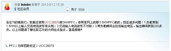 在各种电源的设计中,为了满足高功率因数的,以及较低的THD谐波的要求,我们经常需要用到PFC电路。现在最常用的PFC架构当属boost结构了。boost结构的PFC芯片这里需要提到一款高效率,高功率密度的PFC芯片了,这就是UCC28070.我们在使用这款芯片进行大功率PFC电路设计的时候,必须充分了解其性能参数,不然的话,就会遇到很多问题了。这里楼主liuleilei 就遇到了问题,主要问题如下:各位TI的精英们,我最近使用UCC28070做3KWPFC,参照官网上的那个5KWPFC做的,现在诸多问题:1.负载带到1.5KW以上输入交流电流波形有尖刺;2.交流输入电流波形不对称;3.带负载瞬间会拉低输出电压,输出瞬间跌到200多伏。以上问题请了解这款芯片的大师给点指点,甚是感谢!帖子链接: